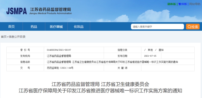 7月26日消息,江蘇省藥監局聯合省衛健委、省醫保局印發《江蘇省推進醫療器械唯一標識工作實施方案》。